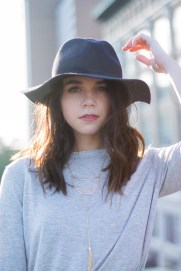 Black Floppy Hat, Gray Tee, and Layered Necklaces